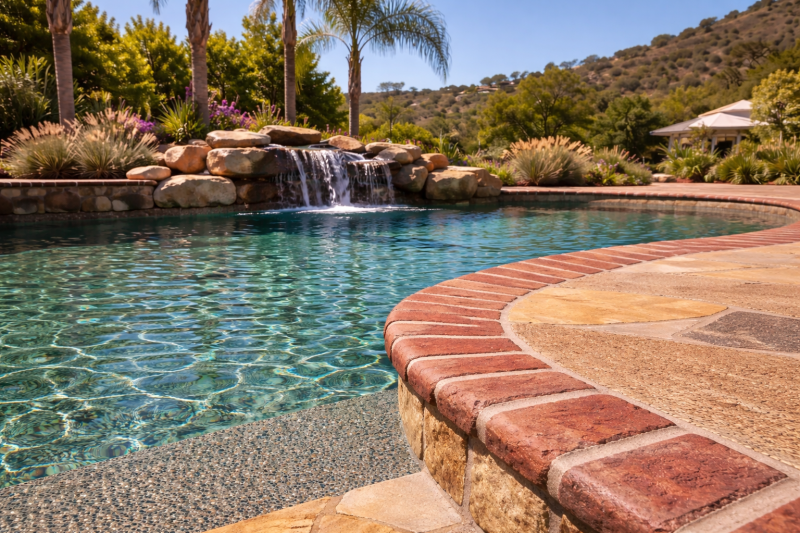 Our Pebble Tec, Brick & Flagstone Cleaning service is designed for textured pool surfaces and surrounding masonry features, including Pebble Tec and pebble-finish areas, brick coping, flagstone coping, raised spa exteriors, spillways, and select stone accents around the pool.